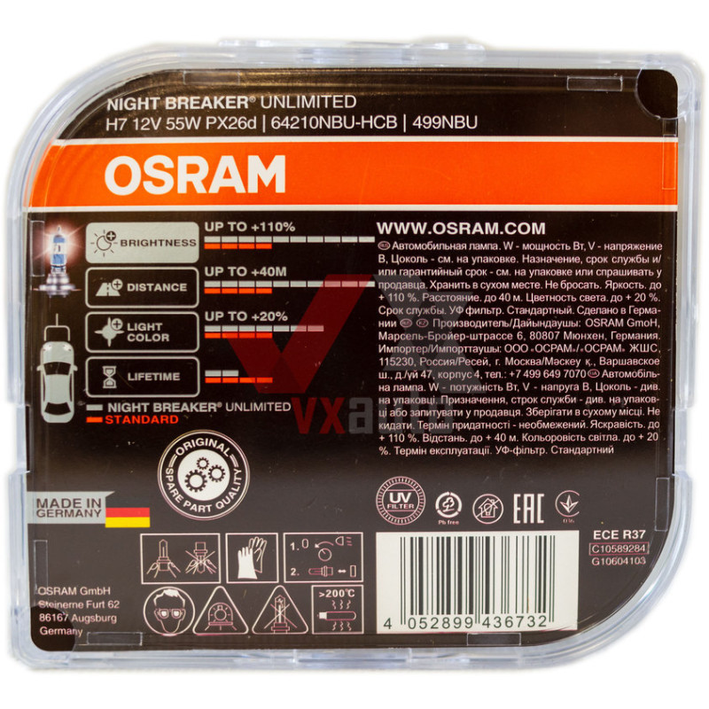 Лампа галогенная H7 12V 55W PX26D +110% Night Breaker Unlimited Osram, к-т (2 шт.)