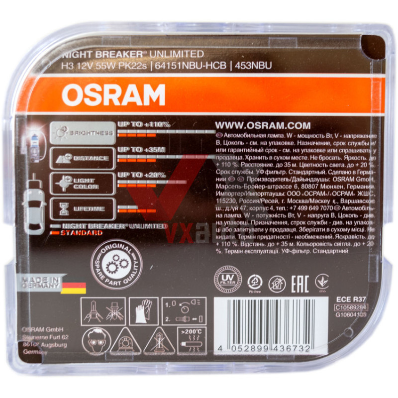 Лампа галогенова H3 12V 55W PK22s +110% Night Breaker Unlimited Osram, к-т (2 шт.)