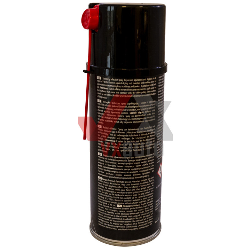 Надзвичайно ефективний спрей для усунення дратівливих шумів, викликаних старінням клинових пасів. Захищає ремені від висихання, зісковзування та розтріскування. Призначений для використання у всіх машинах і обладнанні з ремінним приводом. При профілактичному застосуванні значно подовжує термін служби ременів.