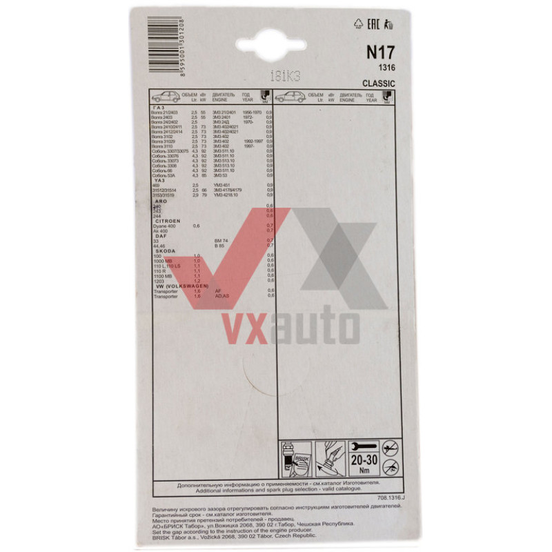 Один заземляющий электрод. Центральный электрод из специального никелевого сплава. Хорошая стойкость к прогоранию электродов. Гальваническое цинкование. Подходит для двигателей без катализаторов. Интервал замены: в соответствии с рекомендациями производителя двигателя.
